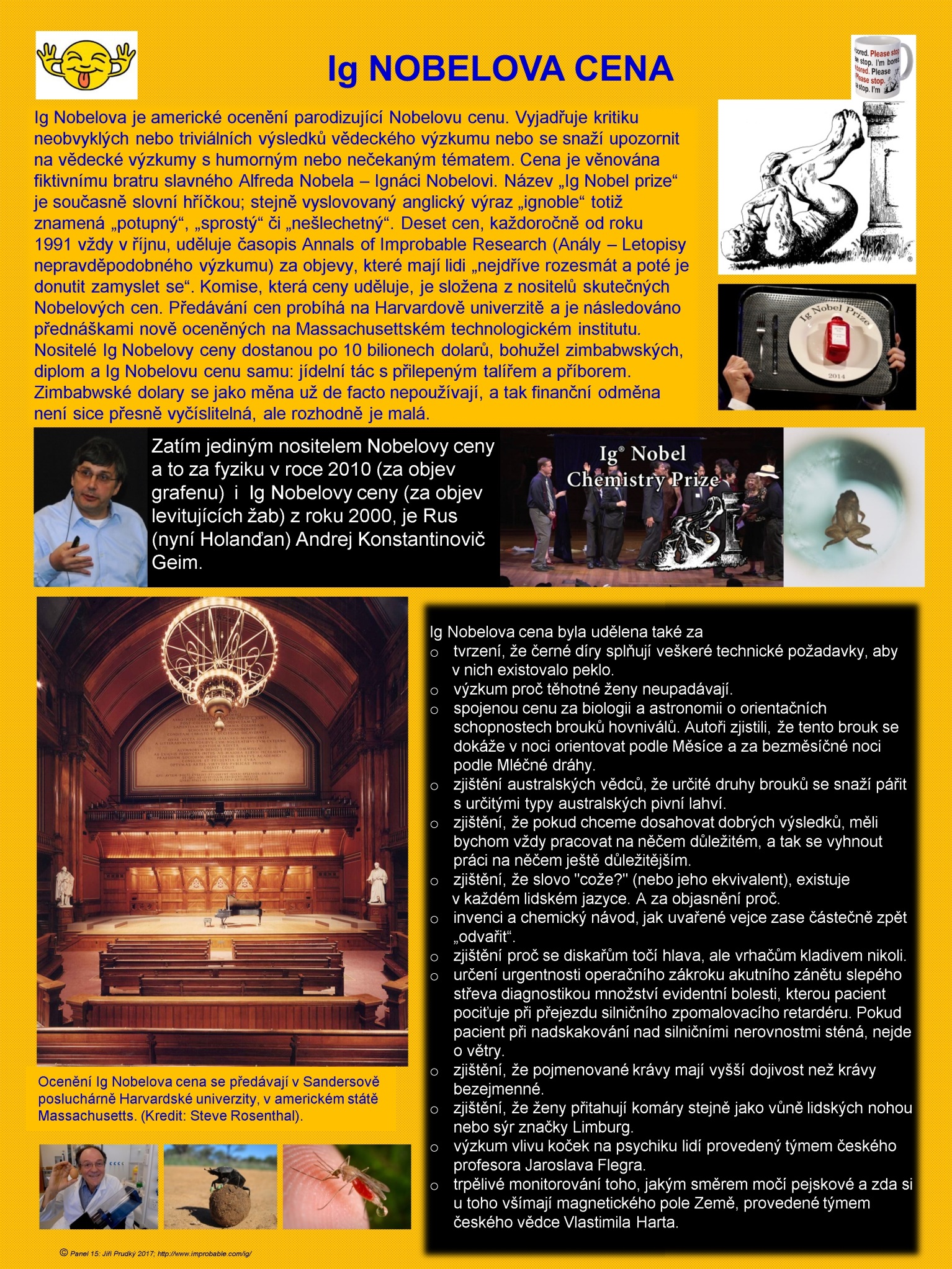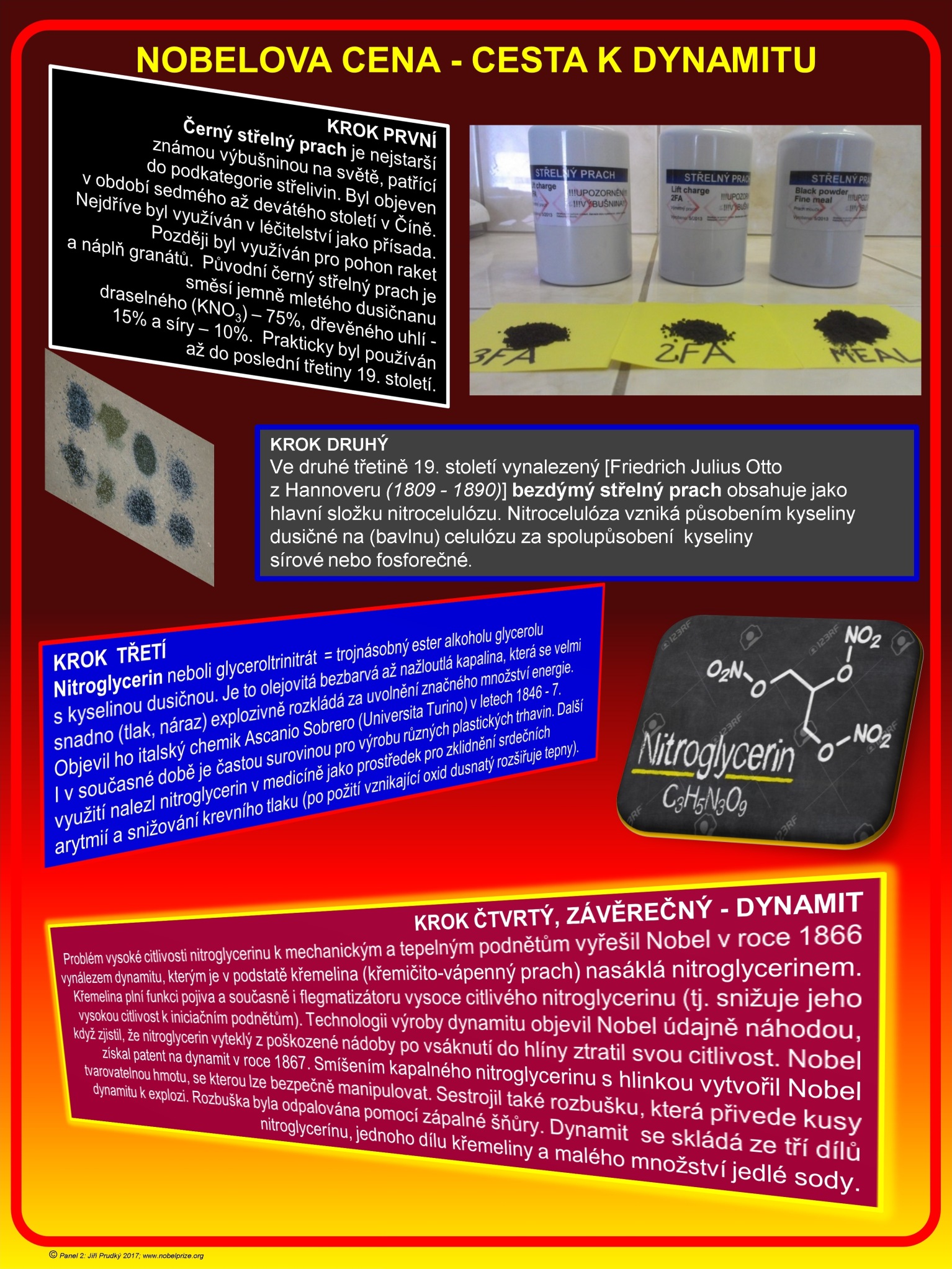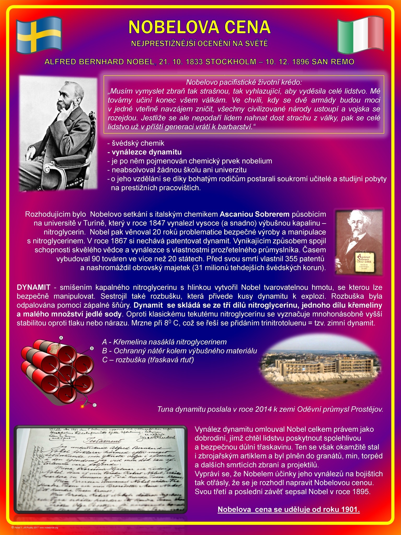 Výstava „Nobelova cena“ představuje osobnost Alfreda Nobela od dětství až po vynález dynamitu a důsledky z toho plynoucí, jeho utopistické životní krédo a omluvu lidstvu za vynález dynamitu prostřednictvím unikátní závěti. Seznamuje s historií vynálezu dynamitu. Nobelovu cenu tvoří medaile, diplom i peněžní odměna a výstava přináší podrobný popis těchto složek. V krátkosti jsou představeny obory, za které se Nobelova cena uděluje a dále někteří nositelé a všichni vícenásobní nositelé Nobelových cen. Nechybí samozřejmě informace o dvou českých nositelích Nobelových cen – Jaroslavu Heyrovském a Jaroslavu Seifertovi. Je ukázán průběh slavnostního ceremoniálu předávání Nobelových cen a s tím spojený protokol. Představeny jsou rovněž „Nobelova cena“ za ekonomii, Fieldsova medaile za matematiku a IgNobelova cena. Autorem výstavy je RNDr. Jiří Prudký, optik a astronom, který se věnuje popularizační činnosti v oblasti astronomie a kosmonautiky, přednáší na Univerzitě třetího věku při Univerzitě Palackého v Olomouci, a který byl více než čtyři desetiletí ředitelem prostějovské hvězdárny. Výstava „Nobelova cena“ vznikla za finanční podpory statutárního města Prostějova, konkrétně z dotační oblasti „Zdravé město“. Rádi bychom touto cestou městu Prostějov za tuto podporu poděkovali. Vernisáž proběhla na prostějovské hvězdárně 7. listopadu 2017. Výstava obsahuje celkem 16 panelů o rozměrech 70 x 100 cm. V případě zájmu nabízíme zapůjčení této výstavy na školy, či jiné instituce.