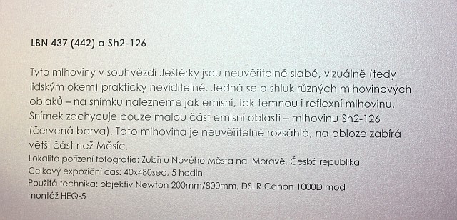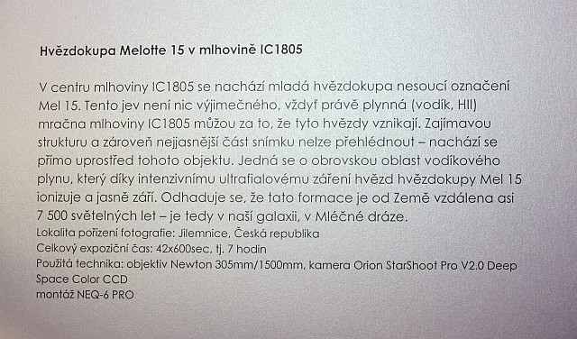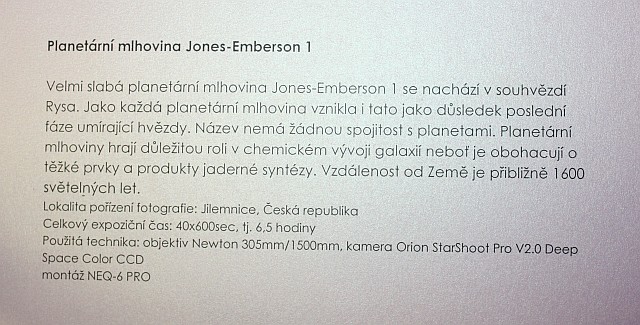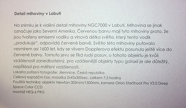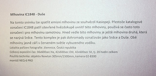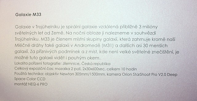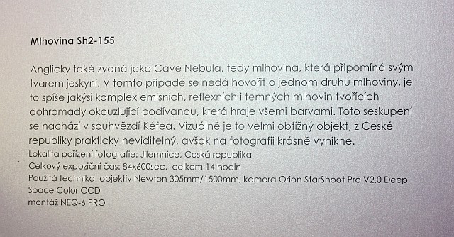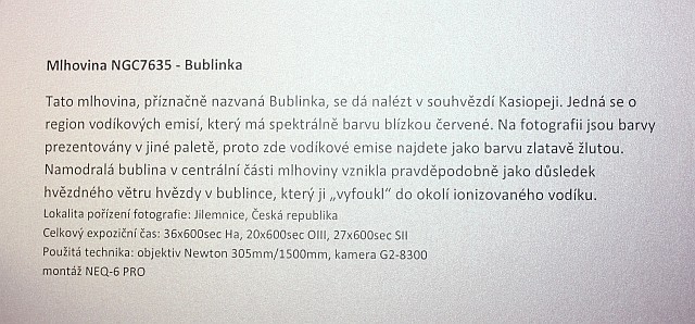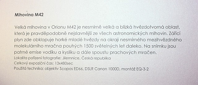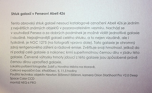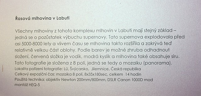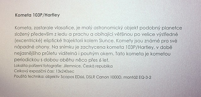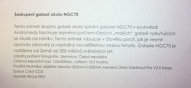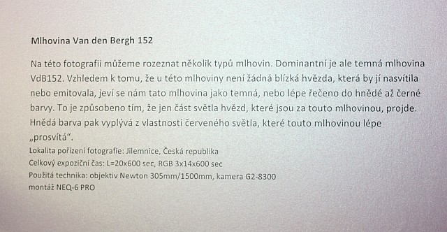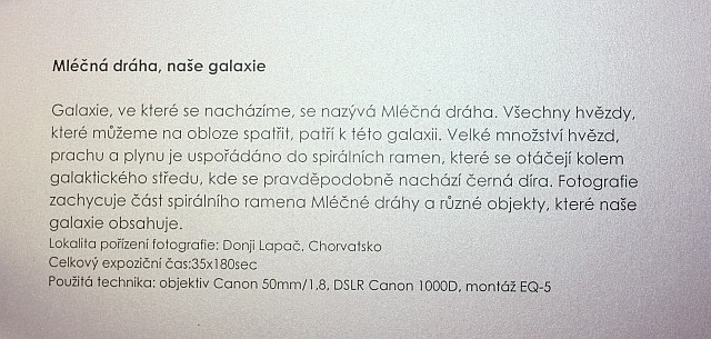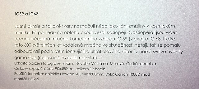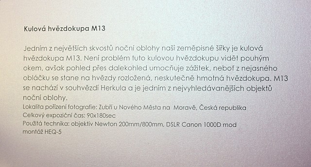 Výstava autorů Mgr. Karla Bůny a Martina Bůny představuje snímky vesmírných objektů v kvalitě, kterou v nedávné době bylo možné dosahovat pouze velkými dalekohledy na profesionálních observatořích. Díky pokroku a zlevnění moderní digitální technologie se možnosti současné amatérské astrofotofrafie značně posunuly vpřed a výstava tak nutí k zamyšlení nejen nad naším místem ve vesmíru, ale též o rychlém technologickém rozvoji naší civilizace. Fotografie astronomických objektů Karla a Martina Bůnových mají v plném rozlišení tak vynikající kvalitu, že umožňují i jejich velkoformátový tisk a nabízí tak návštěvníkovi ještě hlubší zážitek. Výstavu je možné shlédnout v prostorách hvězdárny od data vernisáže 22.února do 27. června 2014. Podrobné informace k jednotlivým fotografiím můžete získat na internetové stránce autorů: http://astrofoto.buna.cz .
